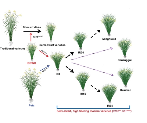 SD1和HTD1等位基因在现代水稻育种中的导入模式图。水稻所供图