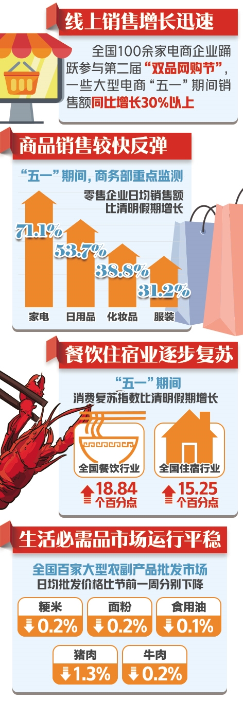 同时,商品销售较快反弹。“五一”期间,商务部重点监测零售企业家电、日用品、化妆品、服装日均销售额比清明假期分别增长71.1%、53.7%、38.8%和31.2%。