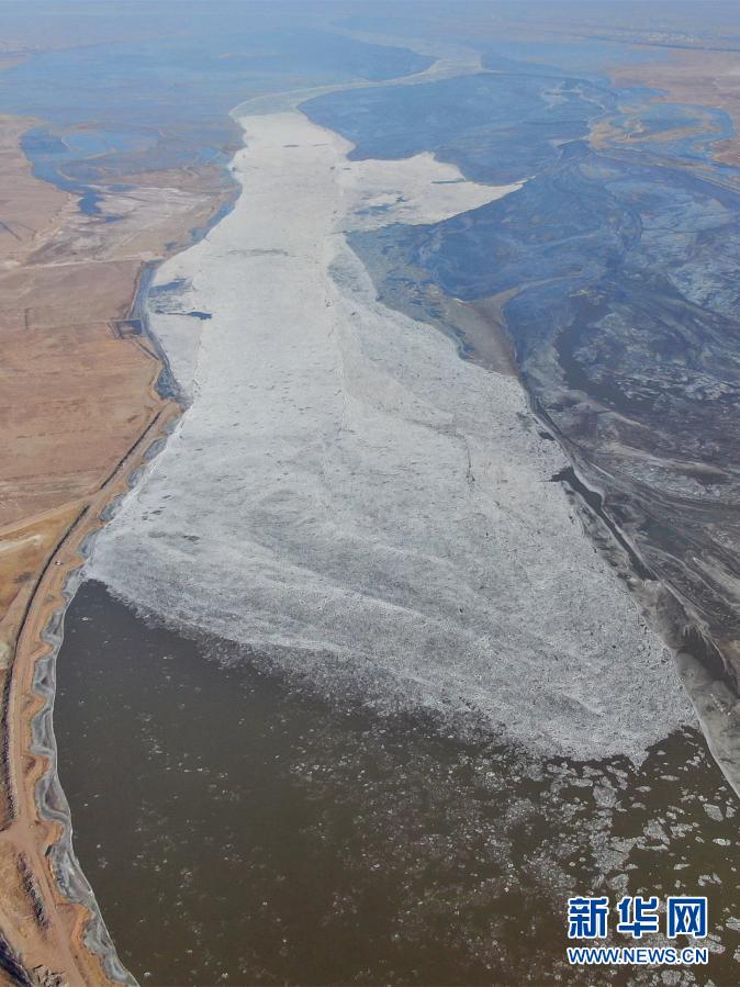 12月25日,黄河封冻至三盛公水利枢纽闸下4公里处,这是当时的黄河封冻与流凌情况(无人机照片)。