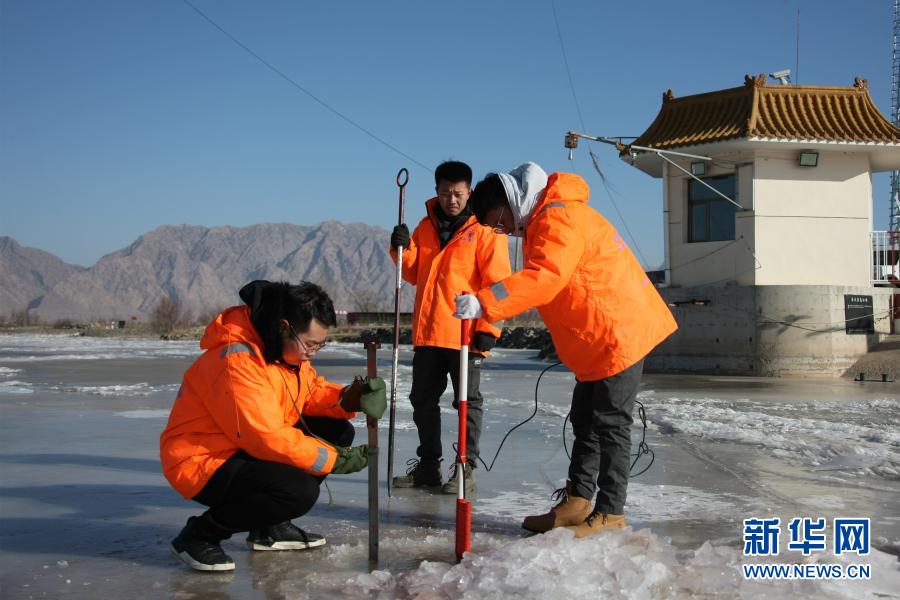 黄委三湖河口水文站工作人员在封冻河面测冰厚与水流速(12月23日摄)。