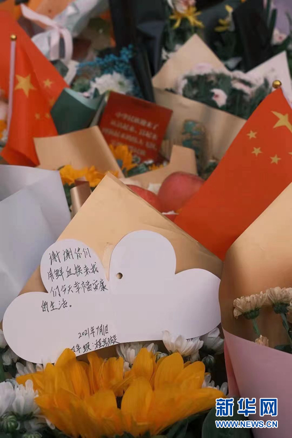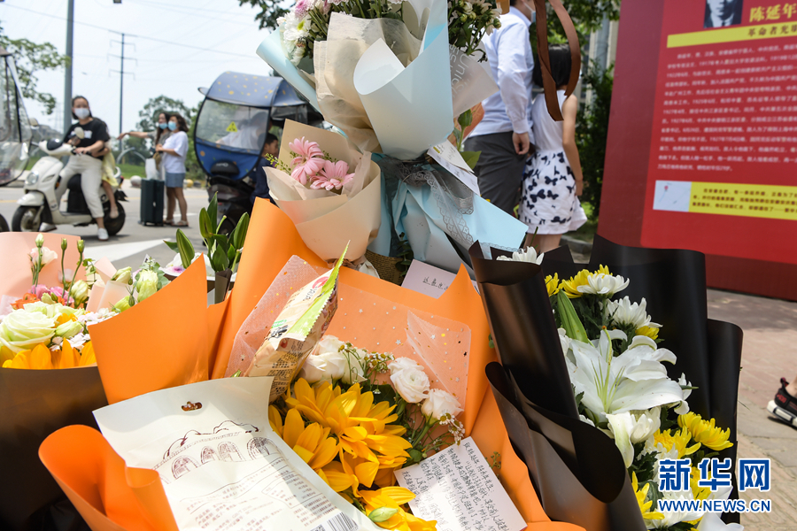 7月1日,许多市民自发来到位于安徽省合肥市的延乔路路牌下献花,向先烈致敬。花束从中的一张卡片上写着:“这盛世,如你们所愿”。随着电视剧《觉醒年代》的热播,剧中烈士陈延年、陈乔年(陈独秀之子)被世人所熟知。在安徽合肥,有一条以陈延年和陈乔年兄弟俩命名的“延乔路”,路的尽头就是“繁华大道”。位于安徽省合肥市的“延乔路”,正是为了纪念烈士陈延年、陈乔年(取名于“延年、乔年”)。新华网发(刘玉才 摄)