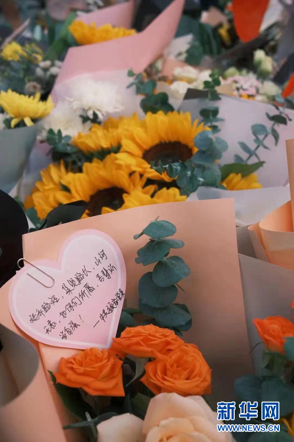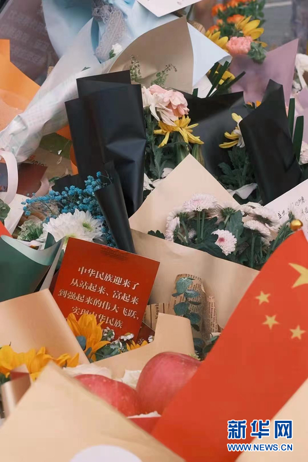 市民来到“延乔路”路牌下献上鲜花、缅怀先烈。新华网发(胡昕萌 摄)