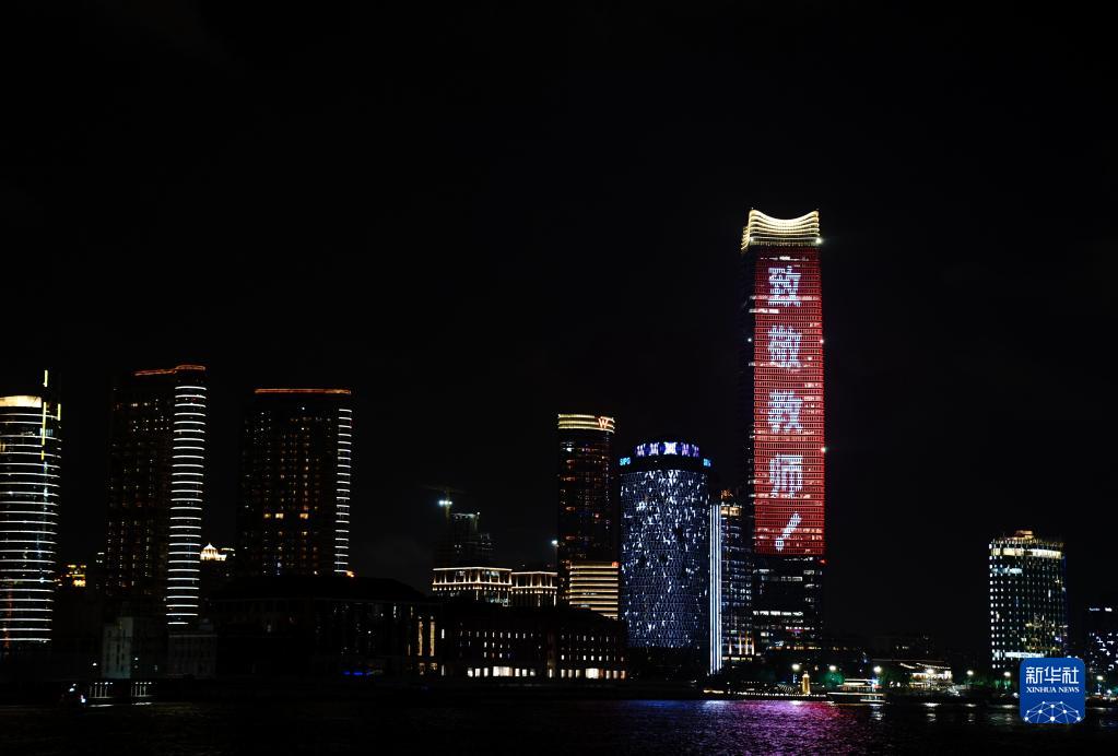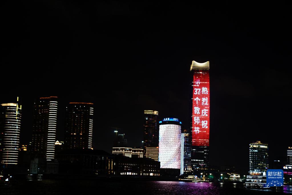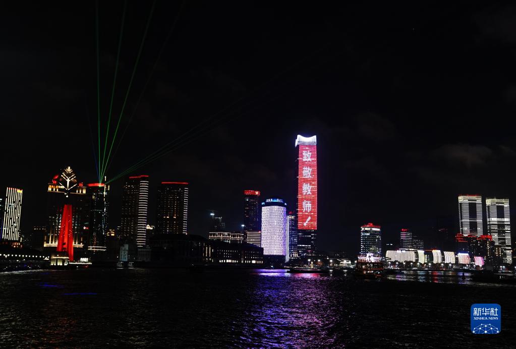 当日是我国第37个教师节,上海外滩上演“灯光秀”点亮祝福语,向广大教师致敬。新华社记者 张建松 摄