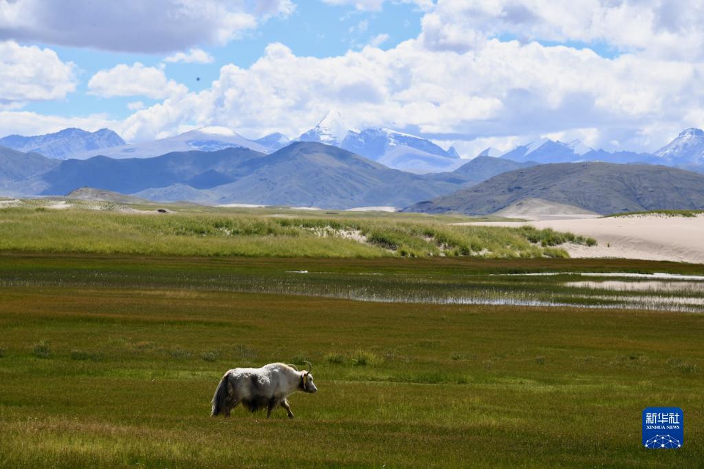 西藏日喀则市仲巴县境内雅鲁藏布江发源地附近,一头牦牛行走在草地上(2018年9月12日摄)。新华社记者 普布扎西 摄
