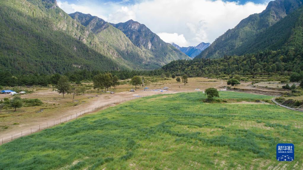 在西藏林芝市米林县,“绿哈达行动”中种植的人工草场郁郁葱葱,长势喜人(2020年9月13日摄,无人机照片)。新华社记者 孙非摄
