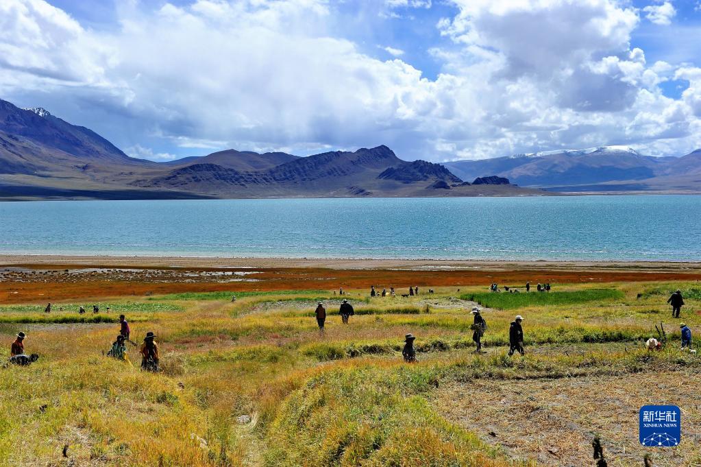 西藏尼玛县文部乡北村的村民在人工草场上收割饲草(2017年9月18日)。新华社记者 张汝锋 摄