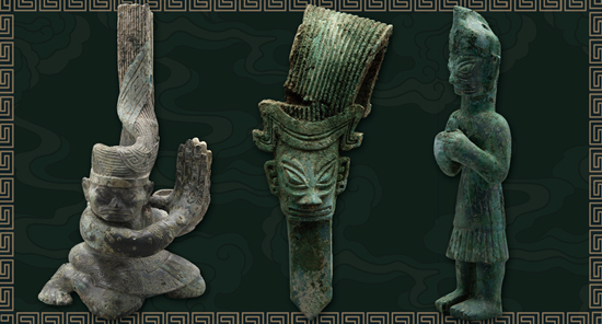 三星堆出土的铜扭头跪坐人像、铜立发人像、铜小立人像(从左至右)。 受访者供图