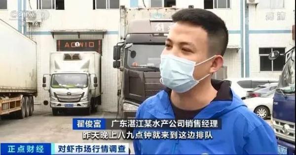 广东湛江某水产公司销售经理 翟俊富:他们大多数是前一天晚上八九点就来排队,早上工人七点半一上班就开始排队装车,一天能发270吨、280吨对虾及对虾成品。