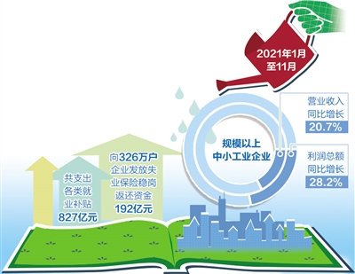中小企业平稳恢复离不开一系列纾困政策的精准实施:2021年全年新增减税降费1万亿元,普惠小微授信户数超过4400万户;2021年前11个月,共支出各类就业补贴827亿元,向326万户企业发放失业保险稳岗返还资金达到192亿元……“我们近期对2.5万家中小企业进行问卷调查,结果显示,85.1%的中小企业认为发展环境有所改善,85%的中小企业认为融资环境有所改善,92%的中小企业认为税费负担减轻。”徐晓兰说。