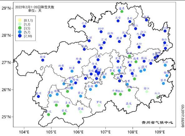 全省累计降雪525站次,偏多385.4站次,为1961年以来历史同期第4多,威宁、水城、毕节、大方、开阳、江口降雪日数最多均达10天。毕节市西部、六盘水市西部、贵阳市局地、铜仁市东部最大积雪深度在5cm以上,其中万山积雪最深达14cm。全省39县(市、区)出现雨凇161站次,其中开阳雨凇日数最多为13天。