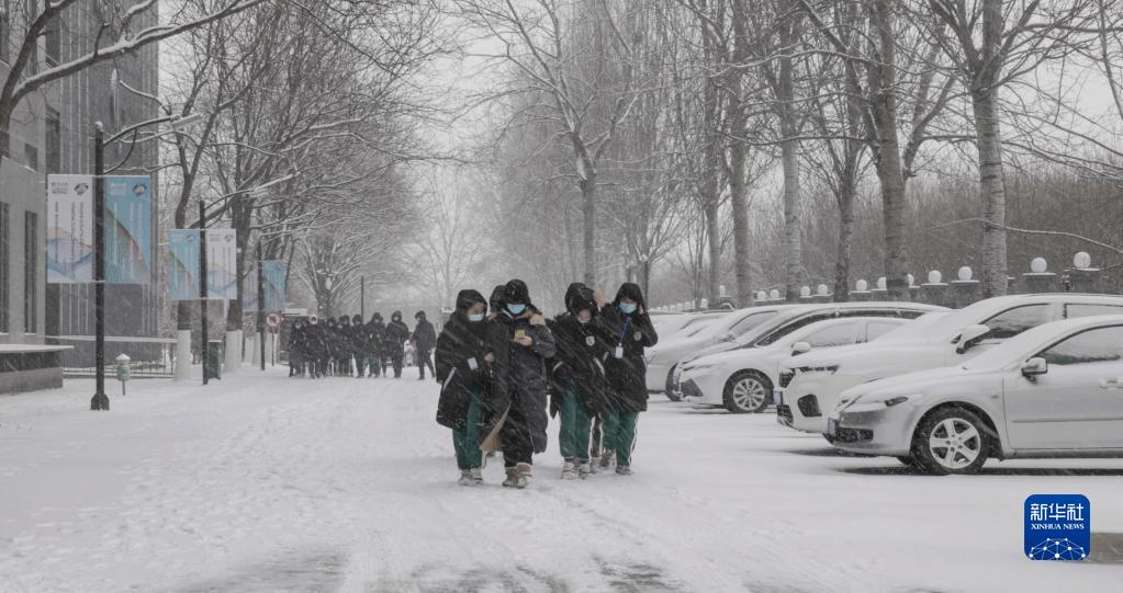 图为重庆市特殊教育中心扬帆管乐团参演团队在北京冒雪前往排练场馆(2月13日摄)。
