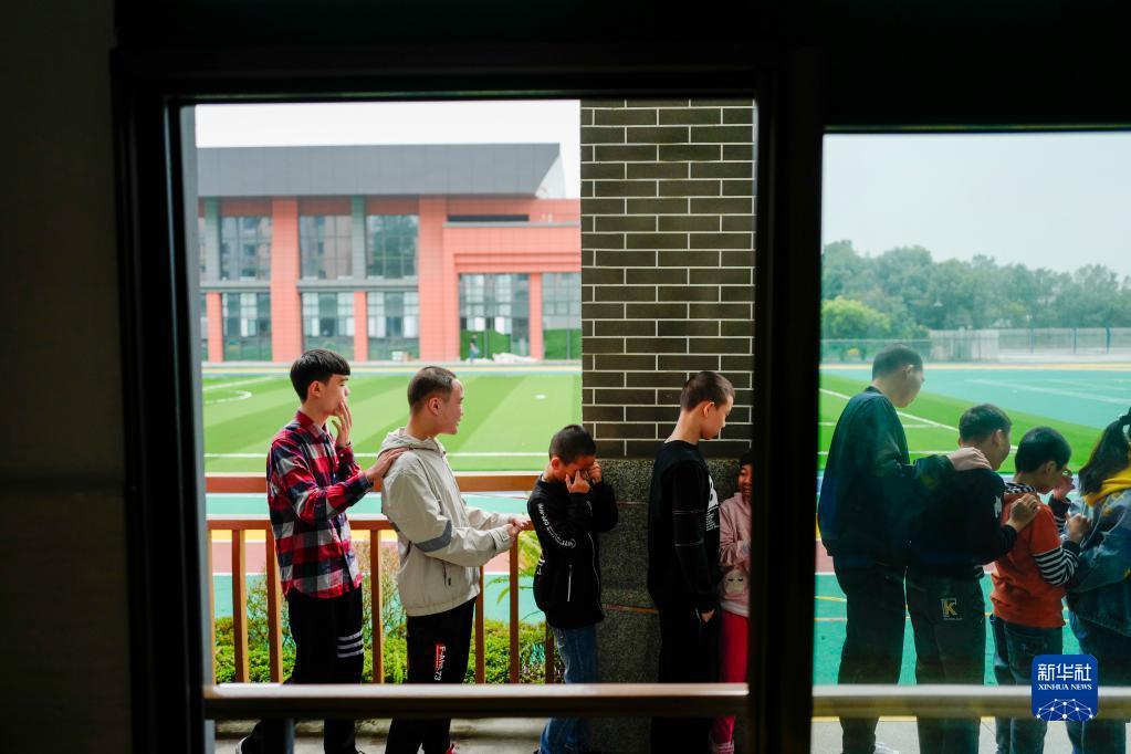 图为在重庆市特殊教育中心的楼道里,学生们互相搭着肩膀排队进入食堂吃饭(2019年10月10日摄)。