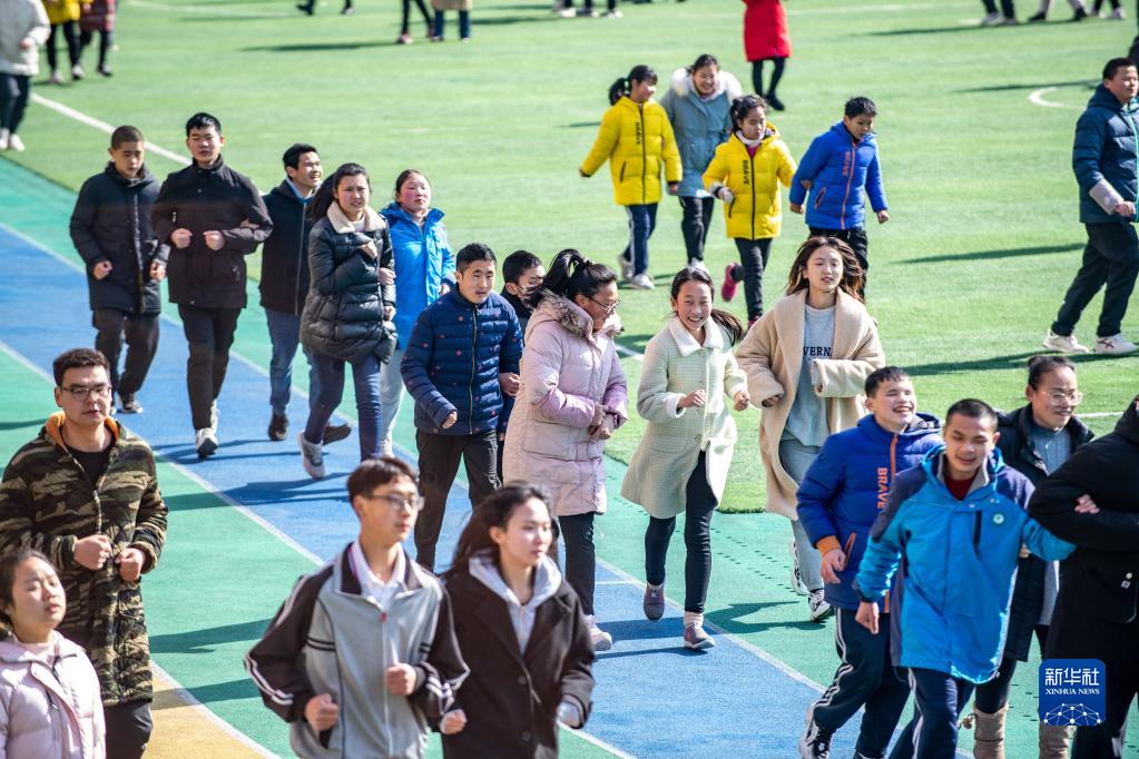 图为重庆市特殊教育中心视障学生在学校操场跑步(2月23日摄)。