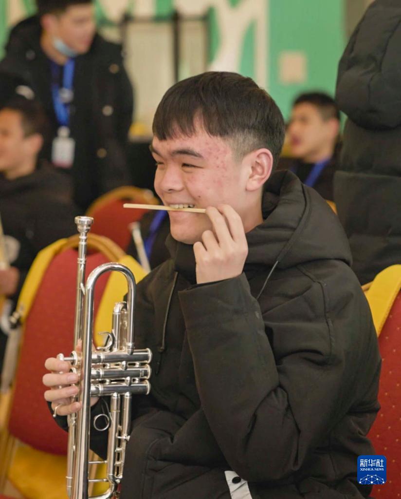 图为在北京排练场馆内,重庆市特殊教育中心扬帆管乐团小号手王太樊以衔筷子的方式练习微笑(2月14日摄)。