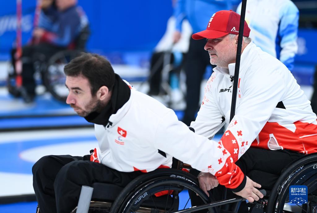 瑞士队选手帕特里克·德拉克勒塔(右)在轮椅冰壶循环赛中协助队友稳定轮椅(3月5日摄)。新华社记者 张博文 摄