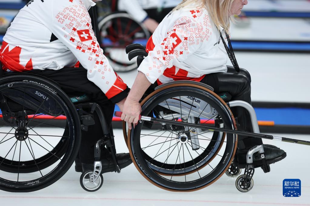 瑞士队选手帕特里克·德拉克勒塔(左)在轮椅冰壶循环赛中协助队友弗朗索瓦丝·雅克诺稳定轮椅(3月7日摄)。新华社发(胡星宇摄)