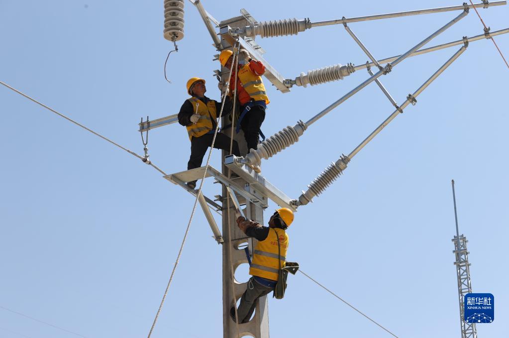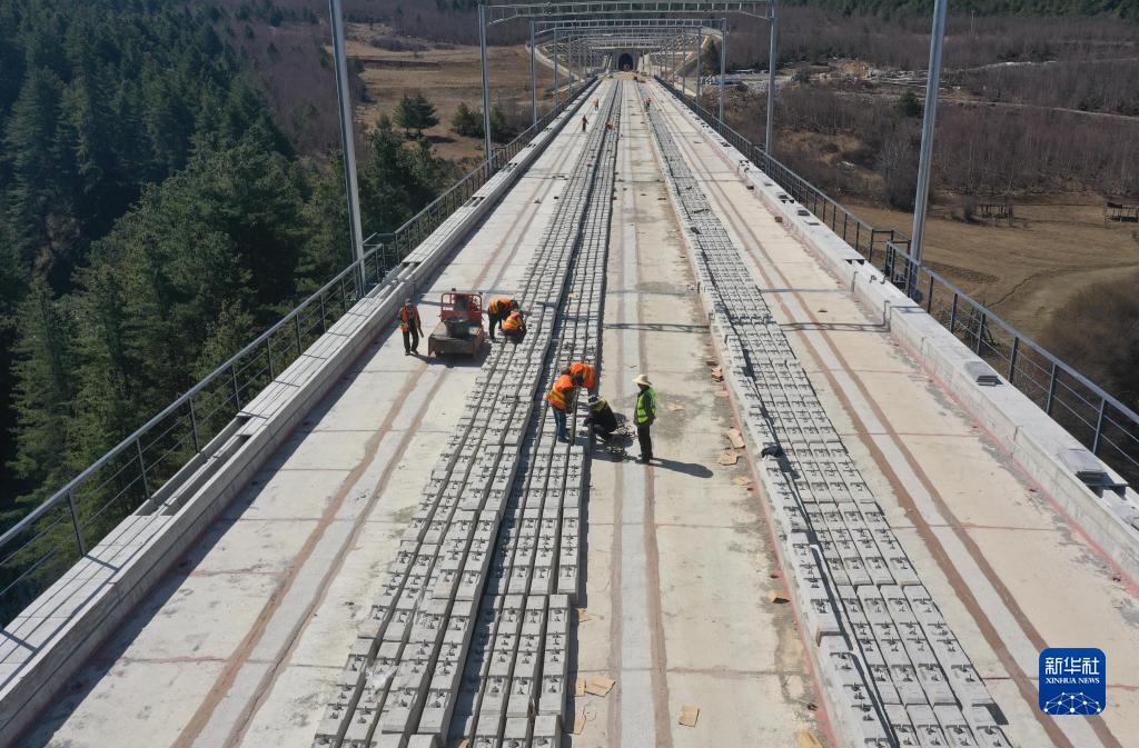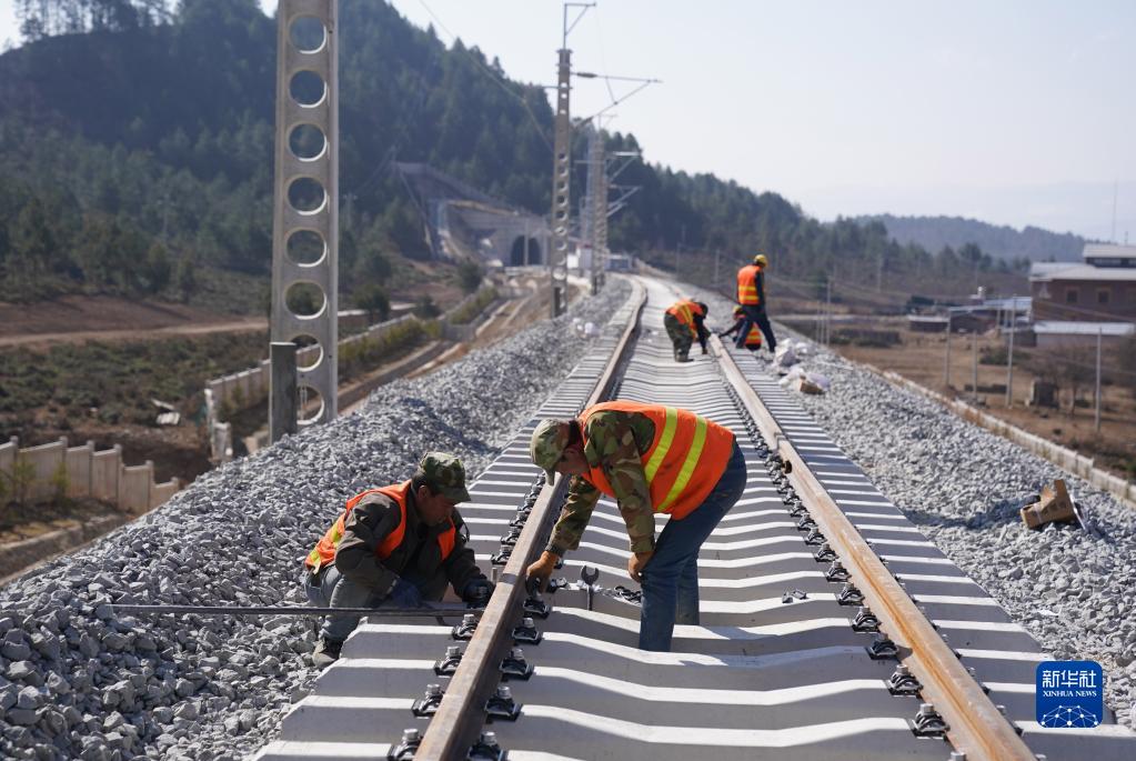 3月16日,工人在丽香铁路迪庆段作业(无人机照片)。