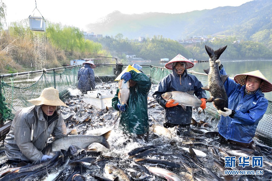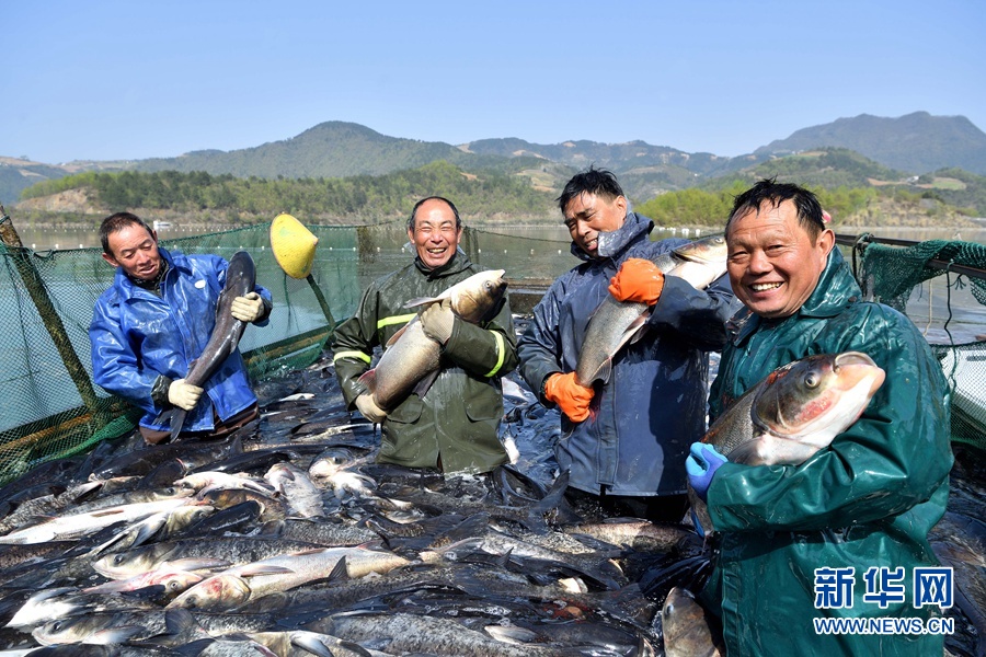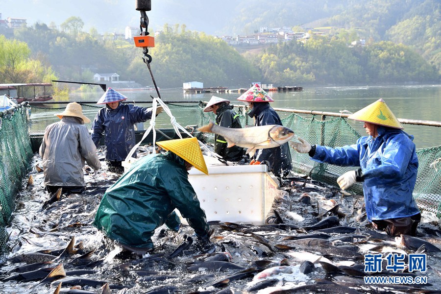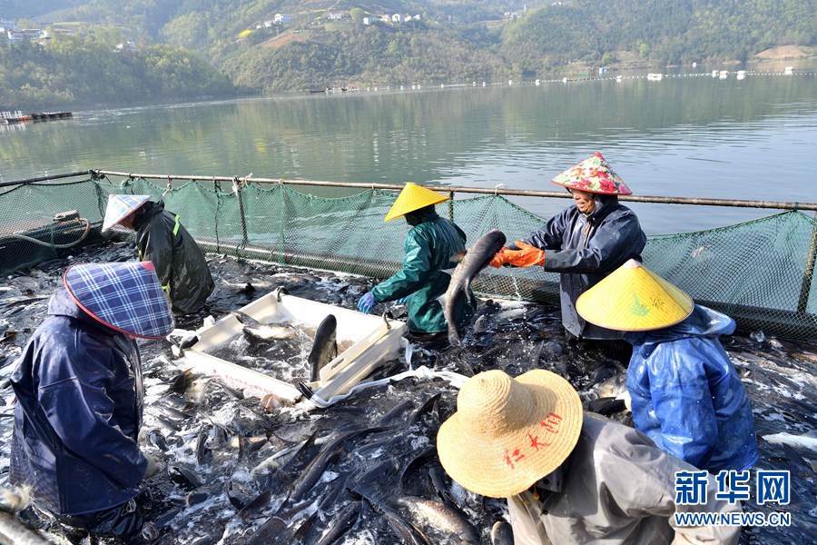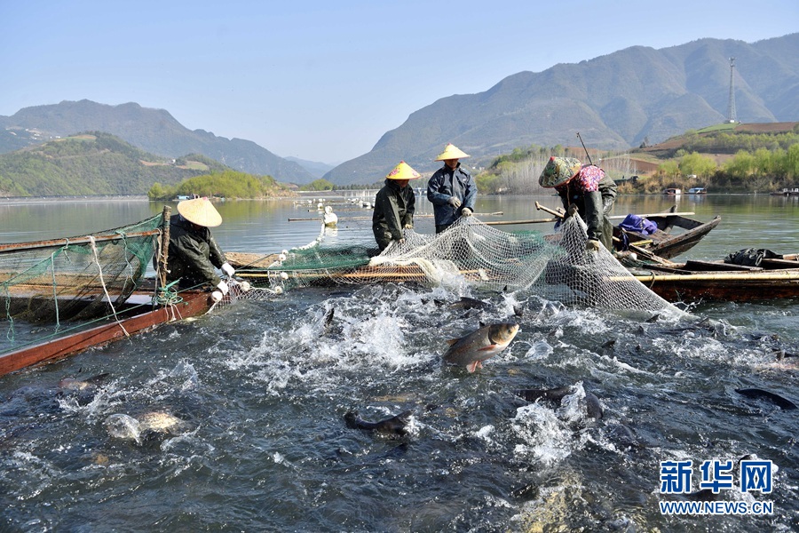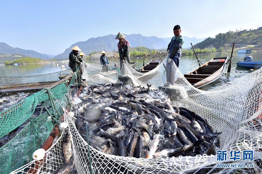 湖北省襄阳市保康县寺坪镇南河渔业农民专业合作社的渔场春捕开网。 杨韬摄 新华网发