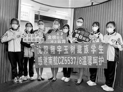 玉树的高三学生乘坐南航飞机返回家乡,看到这些震后成长起来的青年一代,南航北方分公司的工作人员倍感欣慰,特意准备了印有“南航助力 高考加油”“玉树学子,报效祖国”“金榜题名,建设家乡”的手举牌,向他们表达祝福。