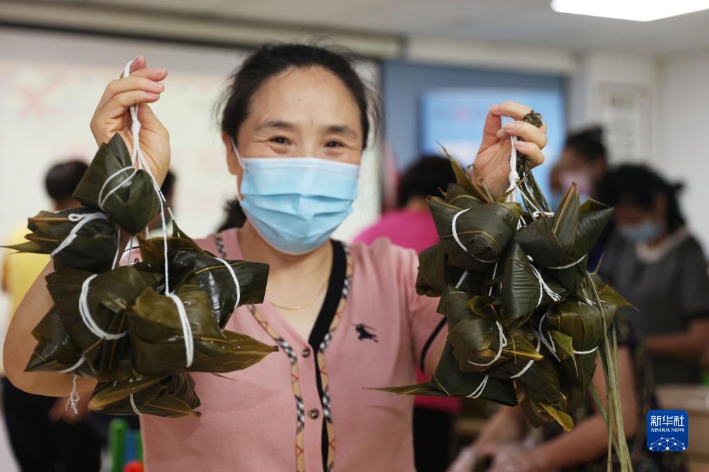 6月2日,厦门市思明区筼筜街道金桥社区居民展示包好的粽子。