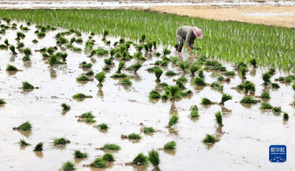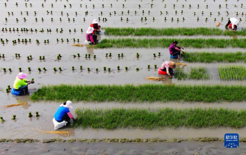 6月14日,山东省临沂市郯城县郯城街道农民进行水稻插秧。