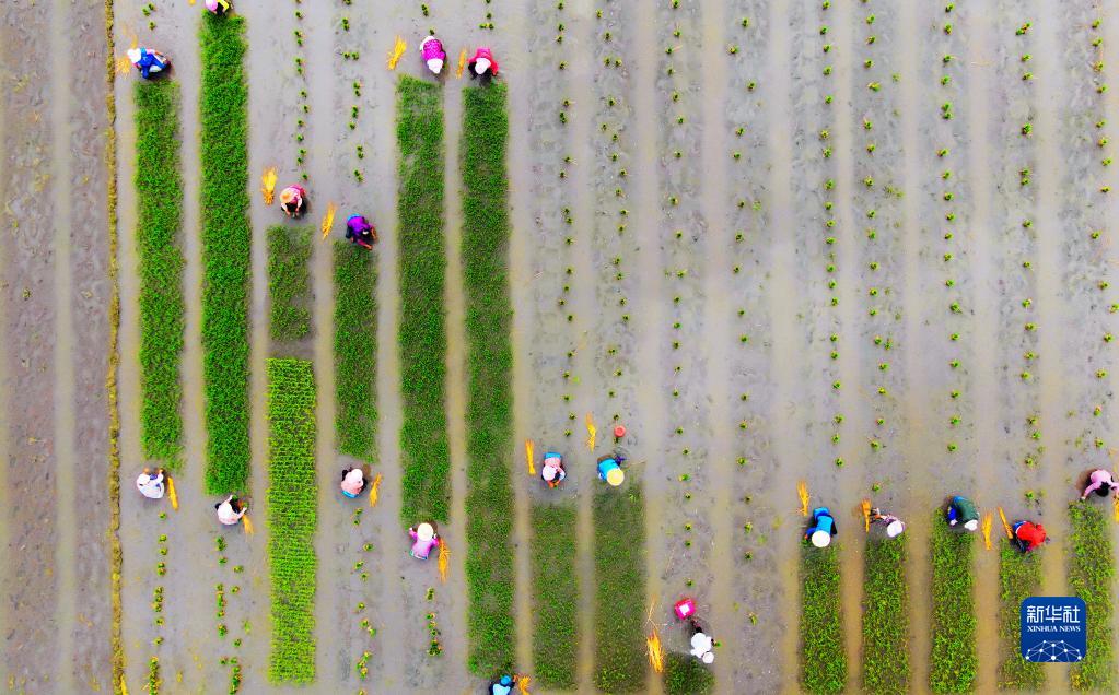 6月13日,农民在江苏里下河地区农科所(扬州市农科院)的试验田中栽插秧苗(无人机照片)。