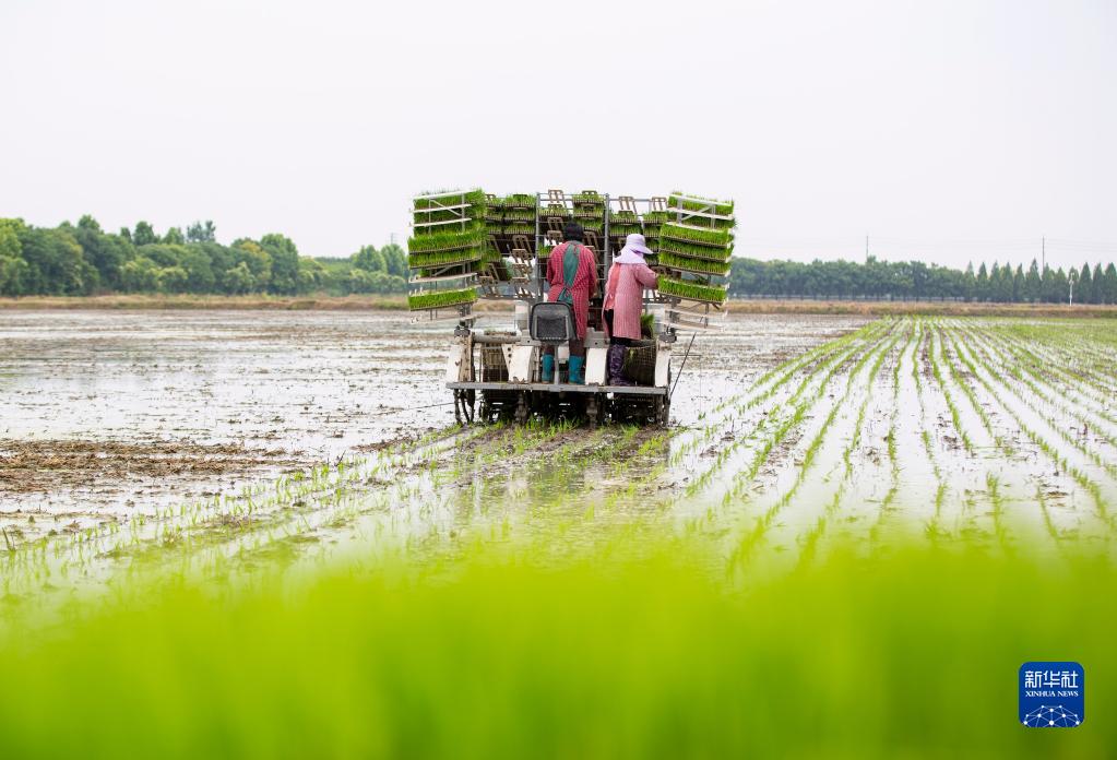 6月12日,江苏省海安市雅周现代农业园的农民在田间进行机插秧作业。