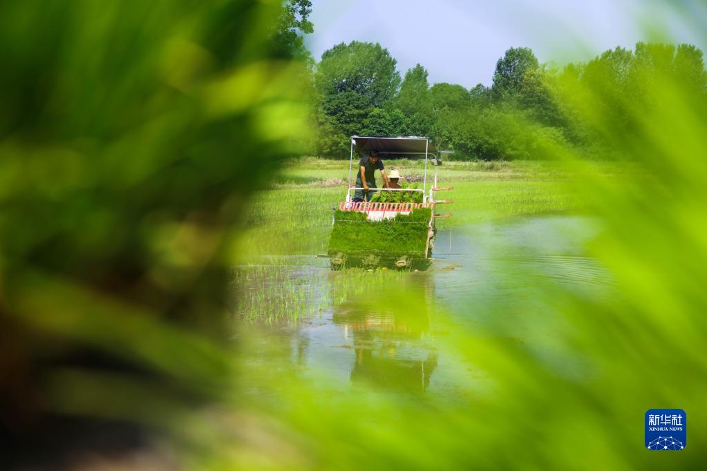 6月14日,河南省信阳市光山县罗陈乡张楼村青龙河合作社农民在田里插秧。