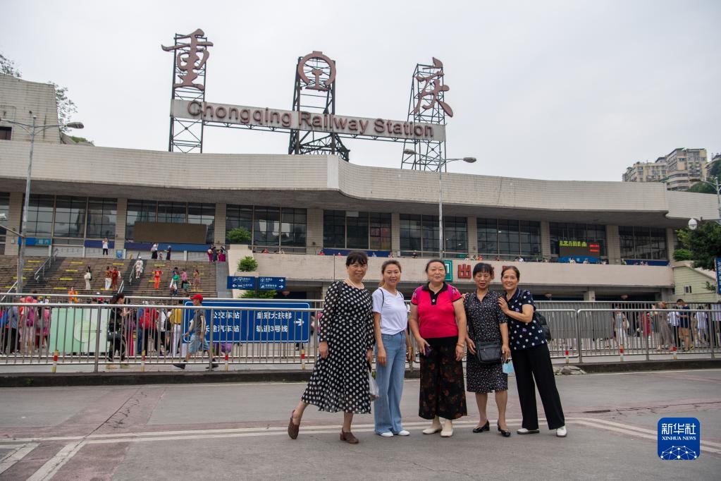 6月17日,人们在重庆站站前广场合影留念。