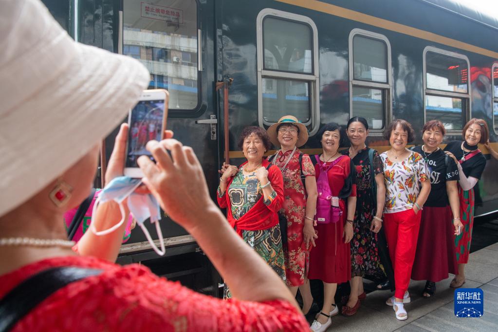 6月17日,人们在重庆站站台上与绿皮车合影留念。