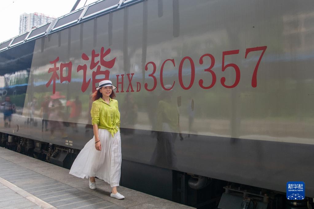 6月17日,一名女子在重庆站站台上与火车合影留念。