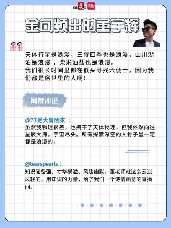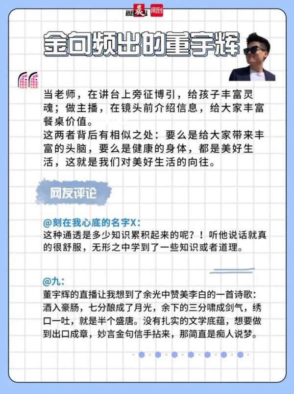 董宇辉曾是一位有着8年教学经验的英语老师,如今转型成为“带货主播”。在他的直播间,成语层出不穷,传统文化与生活哲学交替,没有肾上腺素飙升的刺激和秒杀的紧张,让网友从奔商品而来转变为奔知识而来。