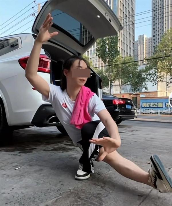 视频中,在一片修车场地上,小杨耍了一段花棍,他左脚抬起伸直,呈一字型水平,右脚稳稳下蹲,全程下盘稳定,动作一气呵成。该视频配文字:“一代宗师,习武之人。”