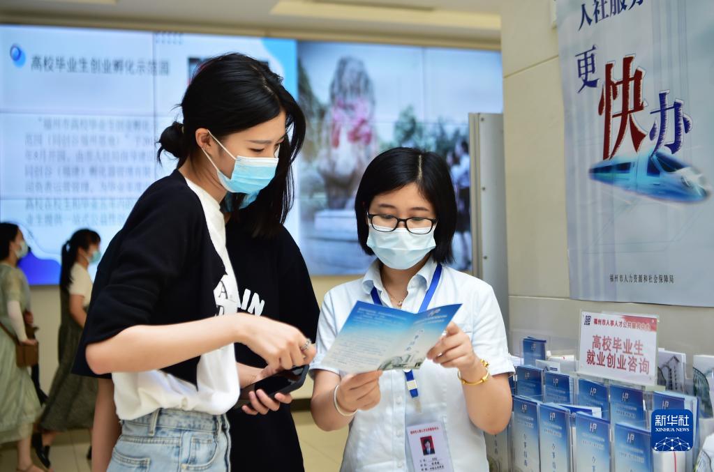 在福州市人事人才公共服务中心,集美大学诚毅学院的一名毕业生(前左)向工作人员咨询1万元一次性生活补贴的申报领取手续(6月29日摄)。新华社记者魏培全 摄