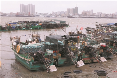 在茂名市电白区博贺湾大桥附近停靠的渔船。新华社发