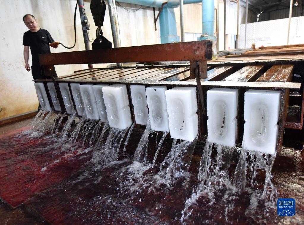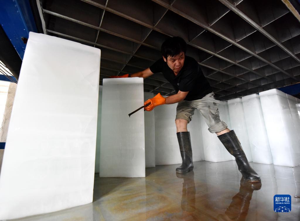 炎炎夏日,人们对冰块需求量增大。在安徽省巢湖市,不少制冰厂订单火爆,制冰设备开足马力不停生产,以满足市场需求。