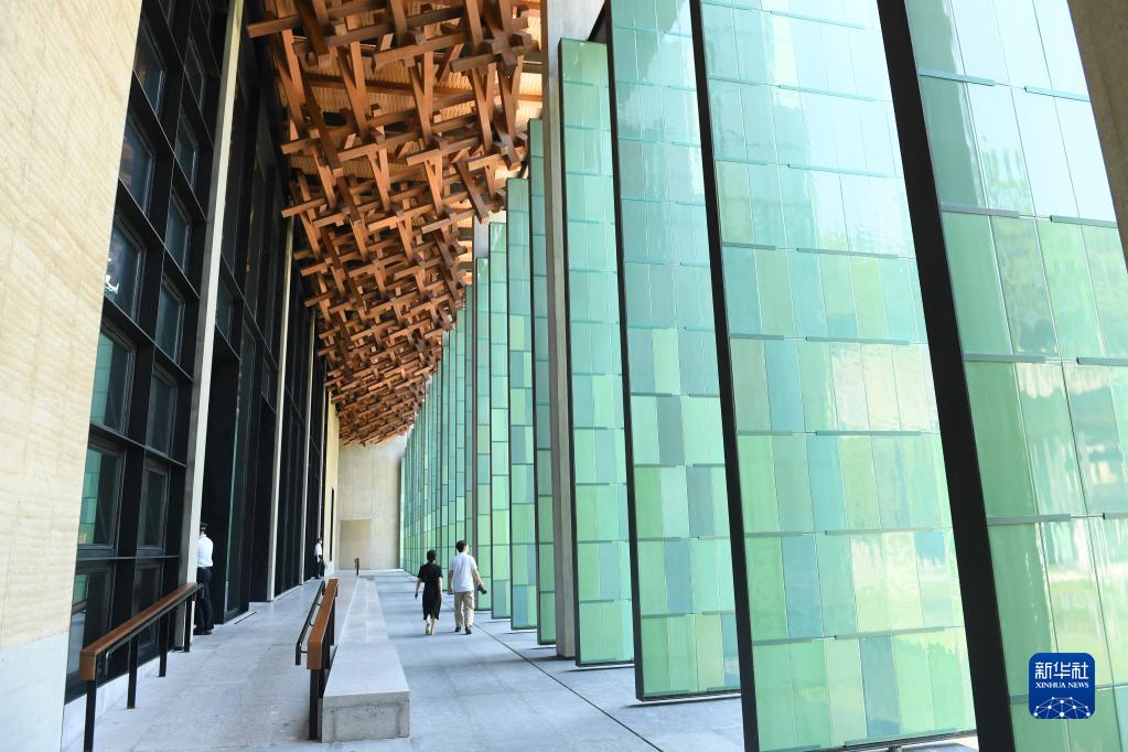 杭州国家版本馆屋顶的木构和青瓷门扇相映成趣(7月23日摄)。