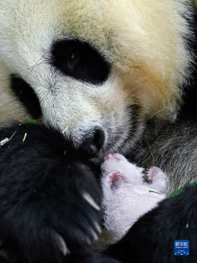 这是在中国大熊猫保护研究中心卧龙神树坪基地拍摄的大熊猫“翠翠”和她刚出生不久的幼仔(8月6日摄)。