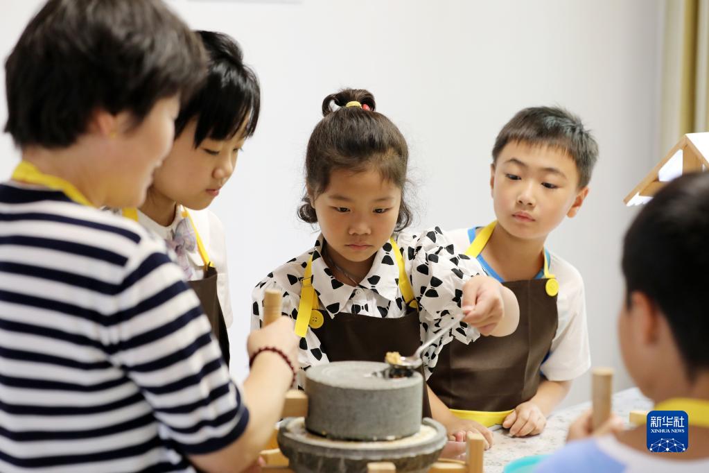 8月27日,在山东省临沂市郯城县郯城街道龙泉社区党群服务中心,社区居民教孩子们使用石磨。