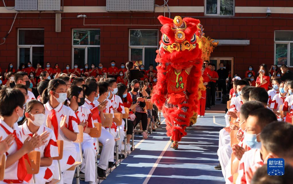9月1日,中国人民大学附属中学分校的师生在开学典礼上进行舞狮舞龙表演。