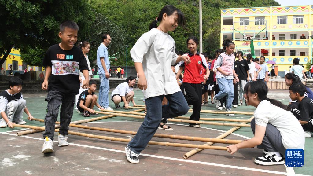 9月1日,广西大化瑶族自治县六也乡六也中心小学的同学们在大课间活动中跳竹竿舞,欢庆新学期开学。