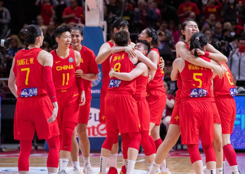 中国女篮队员庆祝晋级世界杯决赛