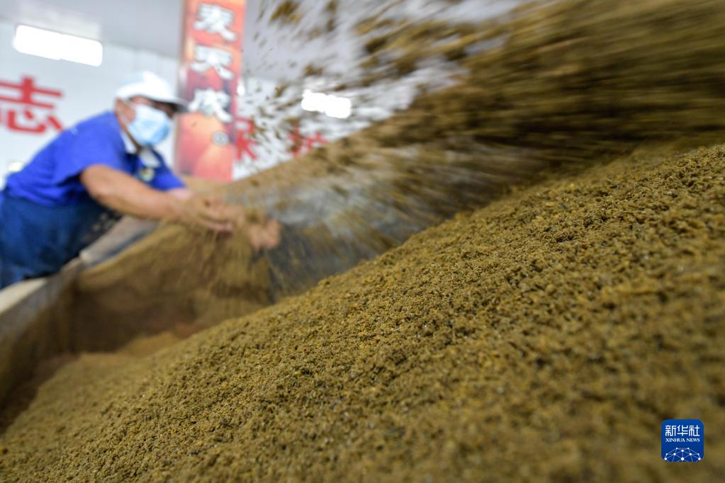 10月28日,在贵州省赤水市黔老翁醋厂,工人在手工翻动醋坯原料。