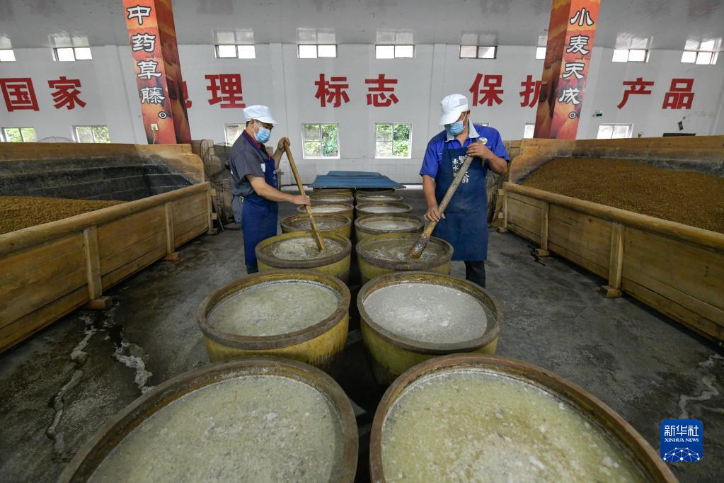 10月28日,在贵州省赤水市黔老翁醋厂晾晒区,工人在搬运制作原料。