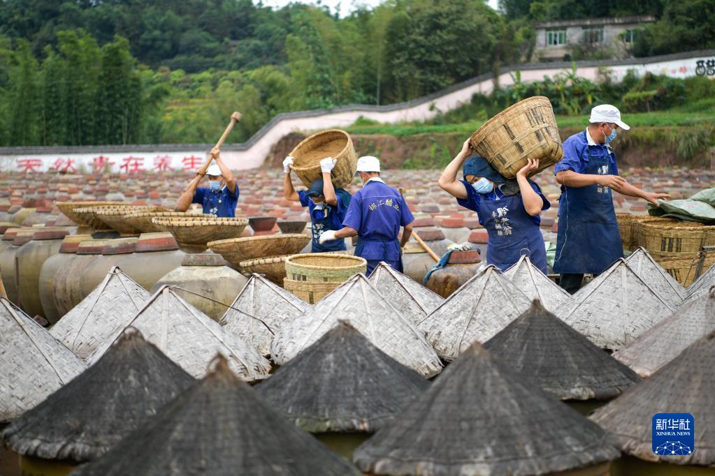 10月28日,在贵州省赤水市黔老翁醋厂,工人在晾晒区查看醋缸中的晒醋成色。
