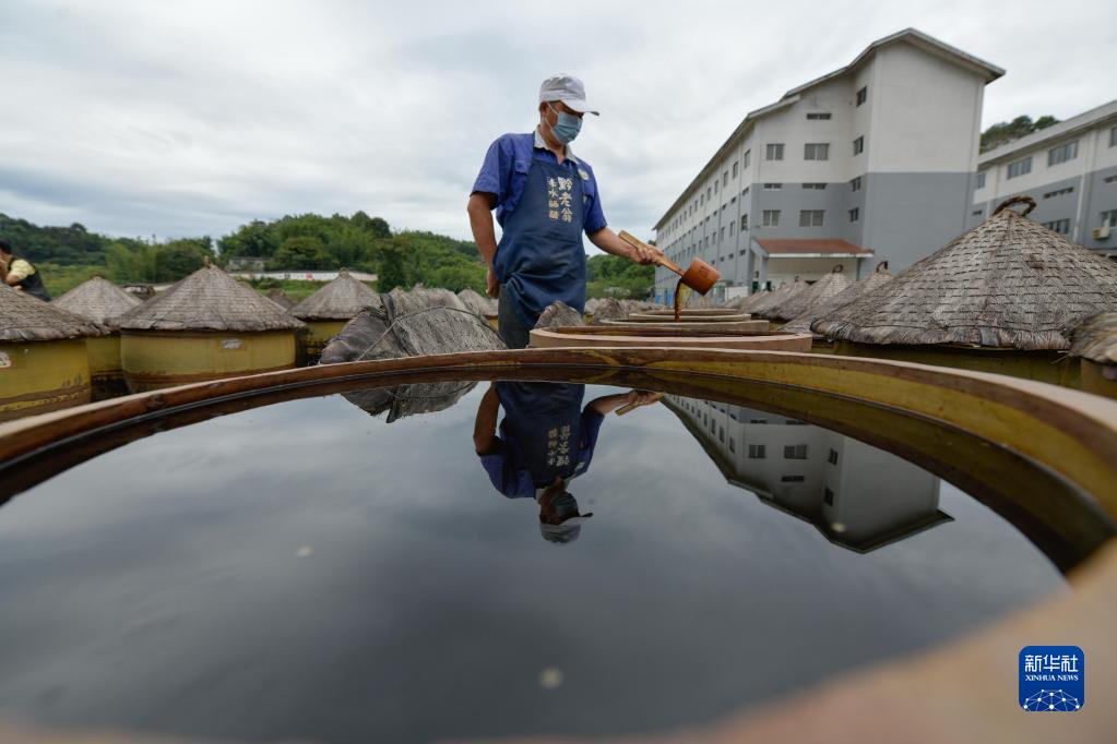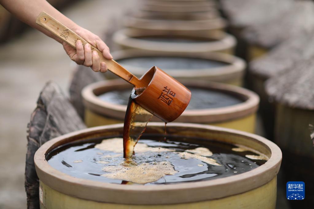 10月28日,在贵州省赤水市黔老翁醋厂,工人在展示酿好的晒醋。