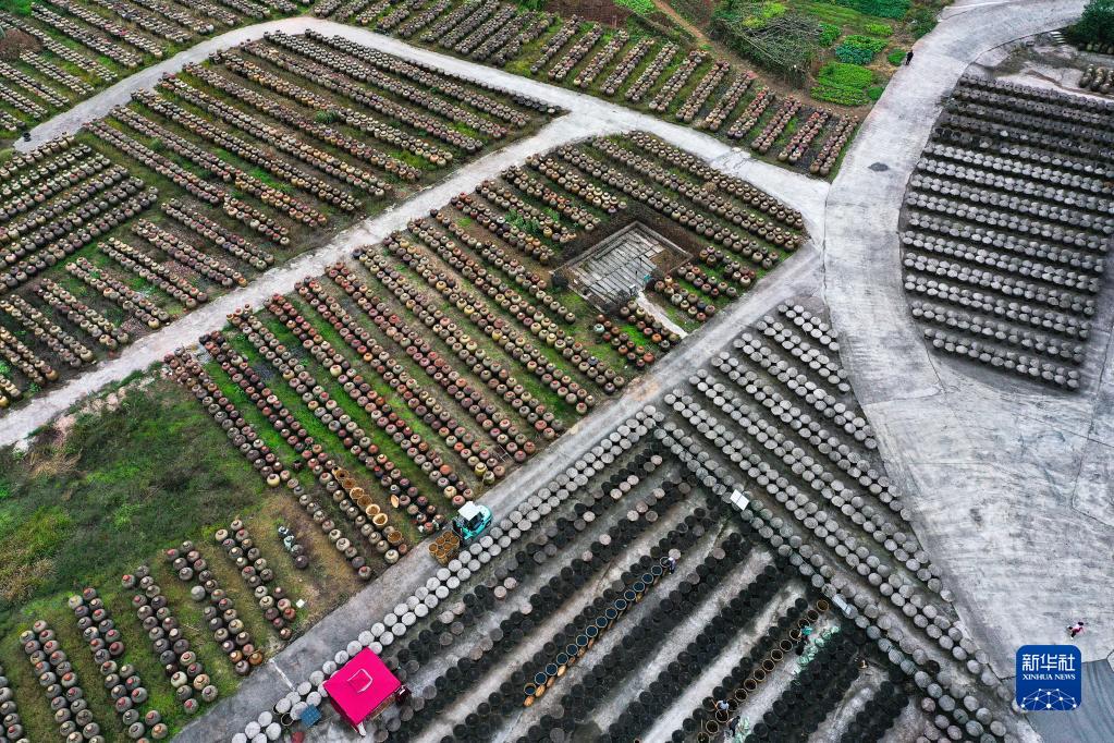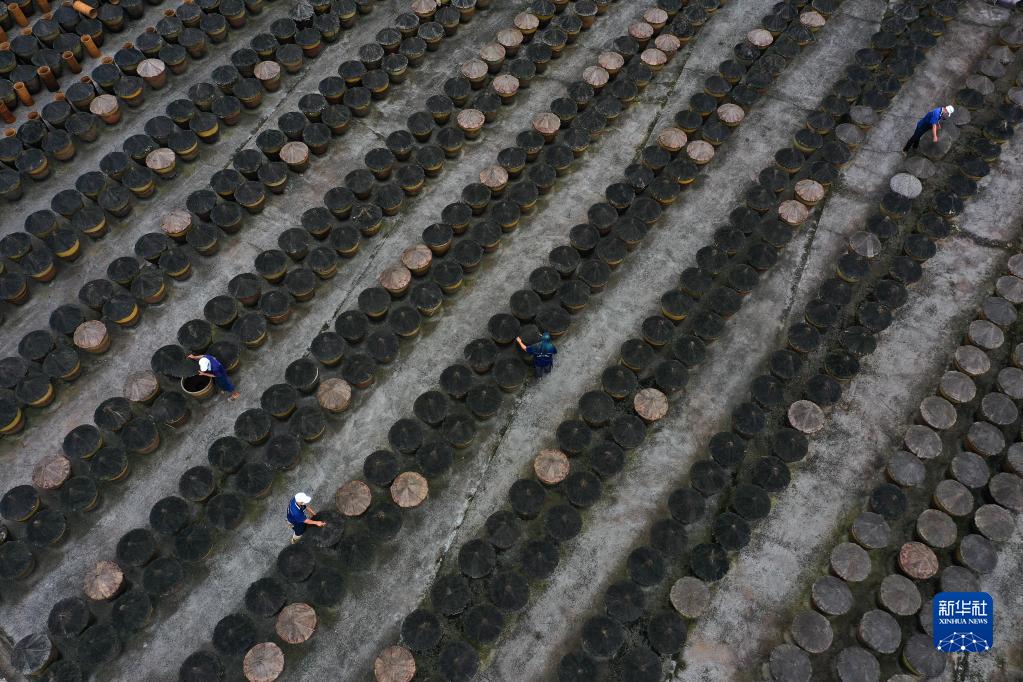 10月28日,在贵州省赤水市黔老翁醋厂,工人在晾晒区作业(无人机照片)。