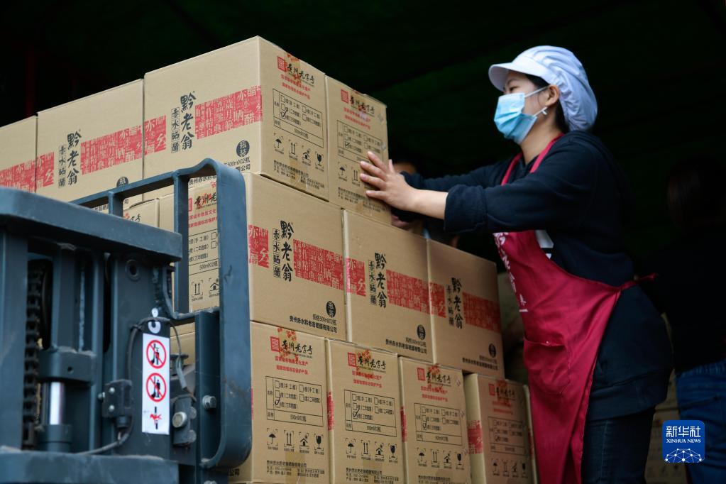 10月28日,在贵州省赤水市黔老翁醋厂,工人搬运成品醋装车,准备外运销售。