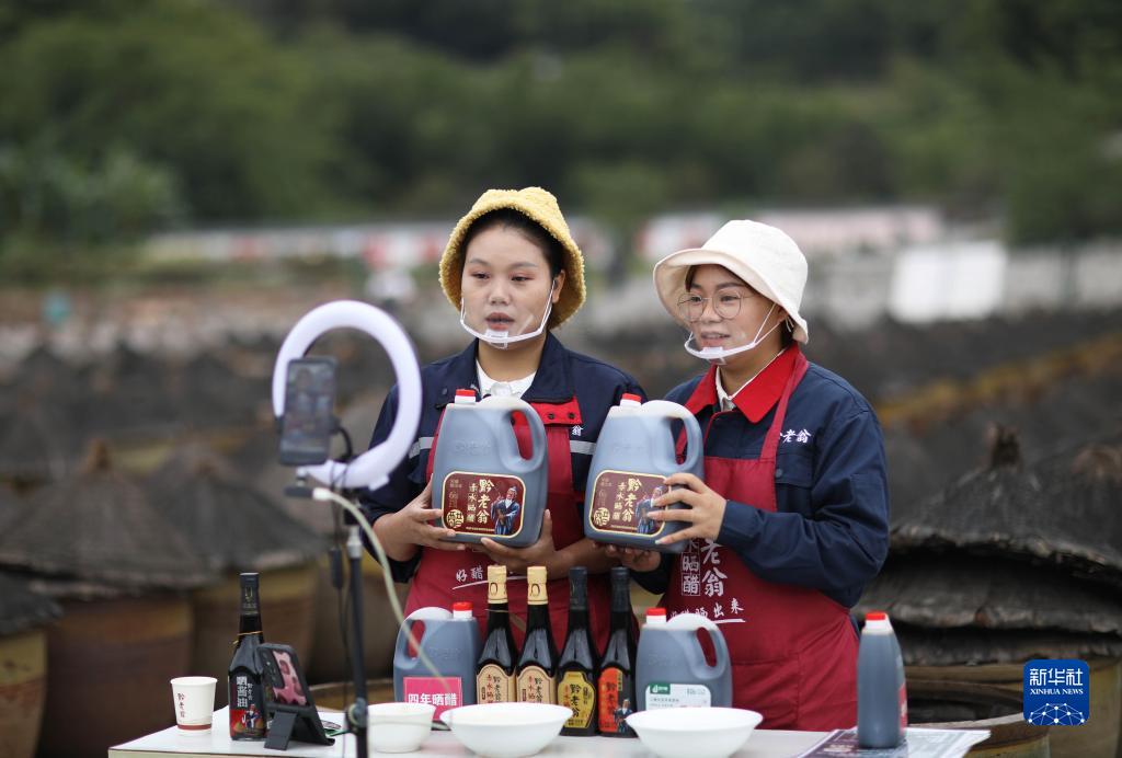 10月28日,在贵州省赤水市黔老翁醋厂,主播通过网络直播方式销售晒醋。