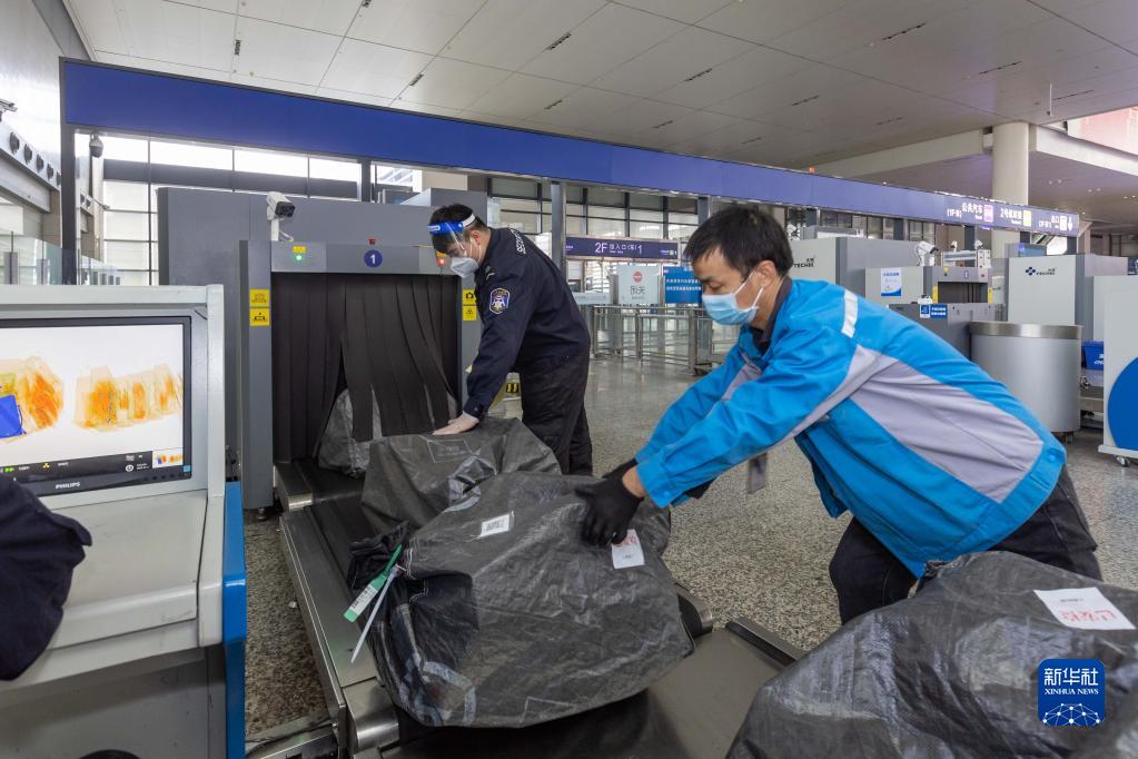 11月1日,在上海虹桥站内货物专用安检口,铁路工作人员搬运通过安检的货物。